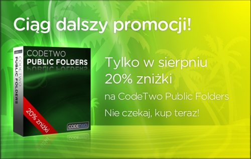Przedłużamy promocję! Do końca sierpnia wszystkie ceny CodeTwo Public Folders są niższe o 20%. Zanim kupisz, przetestuj program za darmo przez 30 dni i zobacz jak łatwo i tanio można zdobyć alternatywę serwera Exchange.