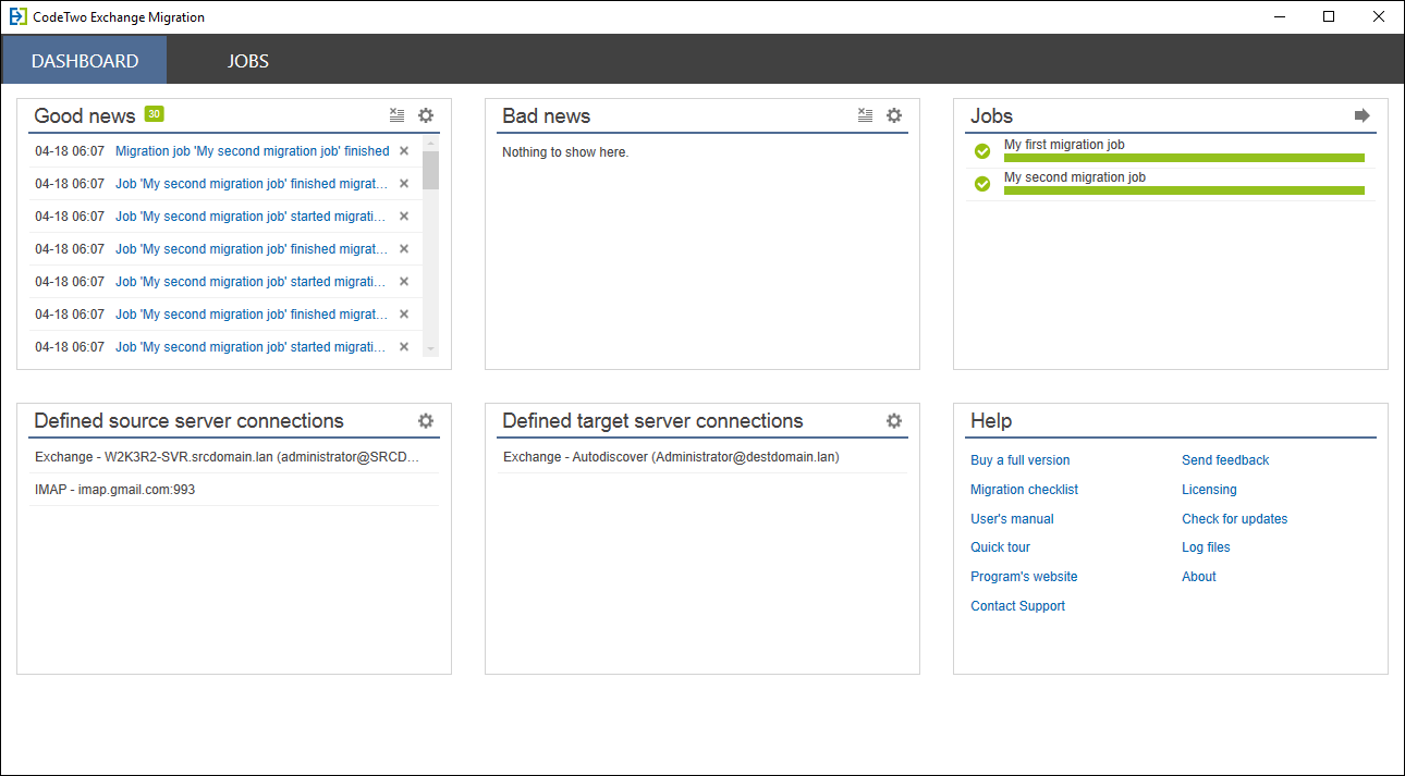 To jest główne okno programu CodeTwo Exchange Migration. Z tego miejsca możesz m.in. szybko przejść do zadań migrujących, sprawdzić aktualny stan migracji czy skonfigurować połączenie z serwerem źródłowym i docelowym.