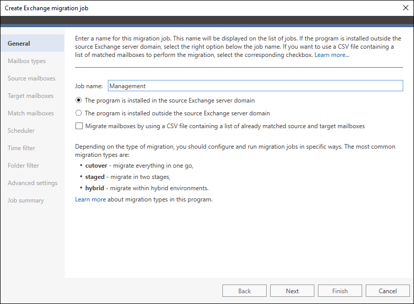 Za pomocą kreatora zadania migrującego możesz utworzyć nowe zadanie i wybrać skrzynki pocztowe do migracji. Program pozwala na migrację do serwera Exchange SE, 2019 lub 2016 z serwera Exchange 2010 lub nowszego, ze Small Business Server 2011, z Microsoft 365, jak i z serwerów wspierających IMAP (m.in. Google Workspace, Zimbra czy Zarafa).