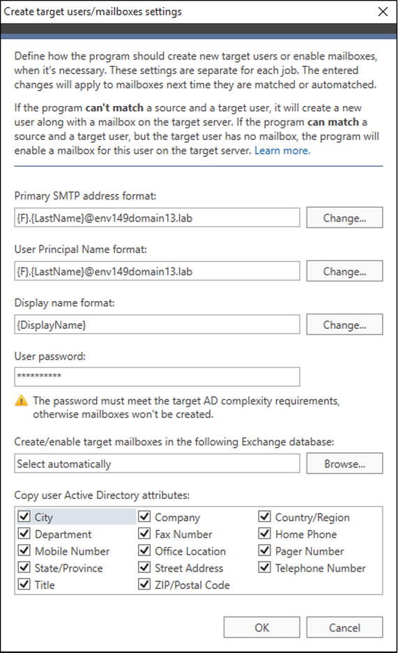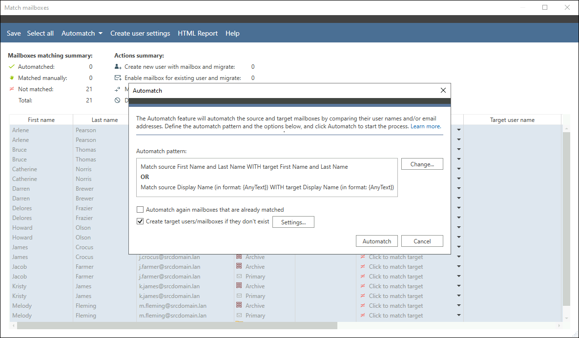 Po wybraniu źródłowych skrzynek pocztowych do migracji możesz użyć opcji Automatch, która dopasuje skrzynki źródłowe do ich odpowiedników na serwerze docelowym. Możesz skorzystać z predefiniowanych wzorów albo stworzyć swój własny wzór dopasowania skrzynek w oparciu o wybrane atrybuty Active Directory.