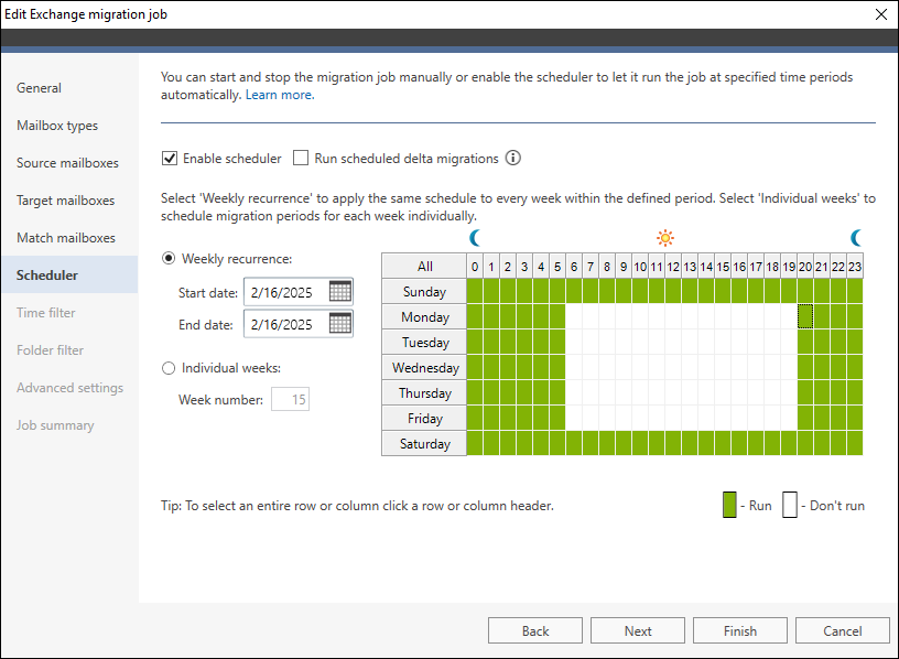 Wbudowany konfigurator harmonogramu migracji pozwala zaplanować, kiedy migracja ma być uruchamiana automatycznie. Funkcja harmonogramu pozwala również na przeprowadzanie automatycznych migracji delta.