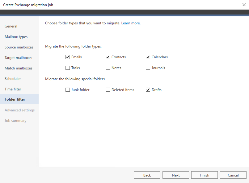 Program pozwala również na filtrowanie danych do migracji. Dzięki zastosowaniu filtru czasu możesz przenieść wyłącznie dane z ostatnich kilku tygodni lub miesięcy. Z kolei filtr folderów pozwala na wykluczenie z zadania migrującego niepotrzebnych folderów, takich jak Wiadomości-śmieci lub Elementy usunięte.
