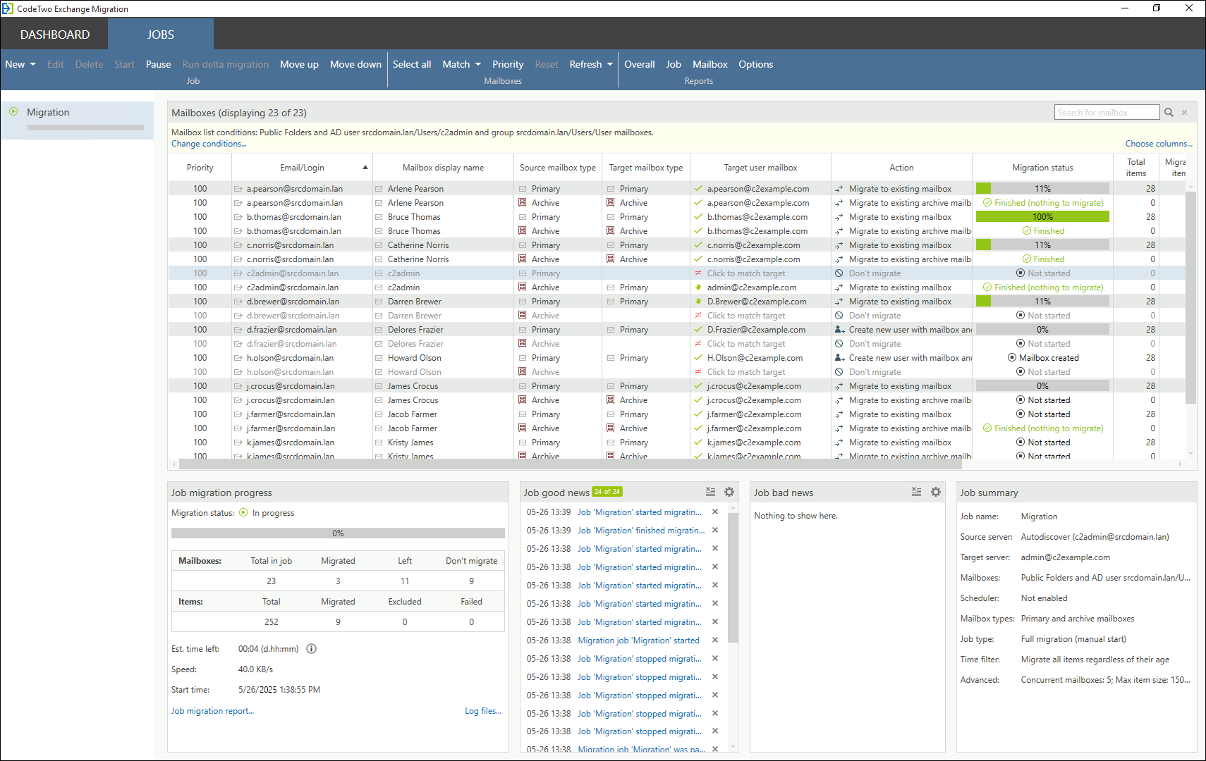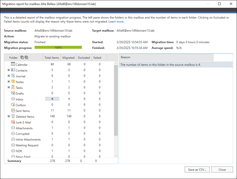 Możesz wysyłać raporty na temat postępów migracji na swój adres email lub wyświetlać je bezpośrednio w programie. Na przykład szczegółowy raport o migracji skrzynki zawiera informacje o statusie migracji pojedynczej skrzynki, natomiast ogólny raport o migracji uwzględnia dane o wszystkich zadaniach migrujących.